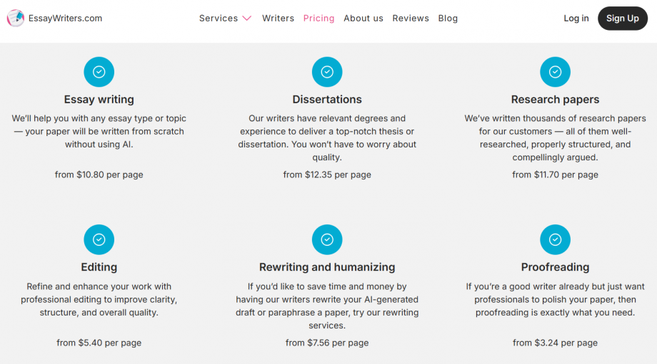 EssayWriters doesn't pull writers from a faceless pool. Every writer on the platform has passed a series of qualification steps, including degree verification, grammar testing, trial orders, and performance reviews. Writers are removed if they repeatedly miss deadlines or get poor ratings.