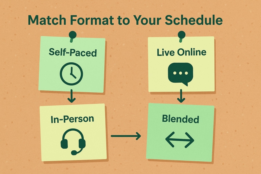 Choose a live workshop if you want immediate answers, enjoy discussion, or struggle to carve study time from a busy calendar. Calendar invites become appointments with your future skill set, and cohort energy keeps motivation high well past the first roll call.