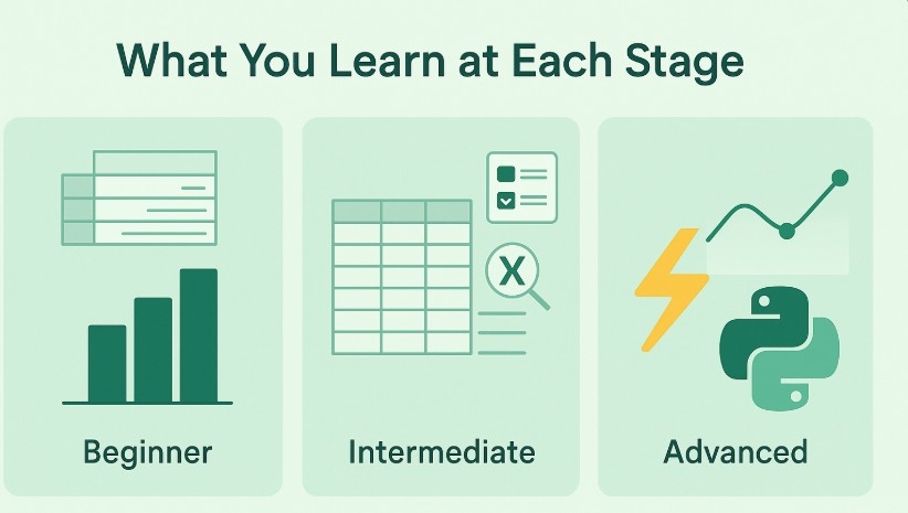 - a skills ladder from basic formatting to Python-driven dashboards