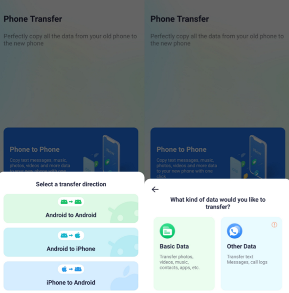 Step 1. As you install and run the “MobileTrans” app on your Android, go to the “Phone to Phone” tab. Upon seeing a bottom-up menu, select “Android to iPhone” and then opt for the “Basic Data” option.
