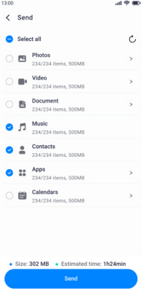 Step 2. Following that, simply choose the “Contacts” option, along with any other data type, and press the “Send” button.