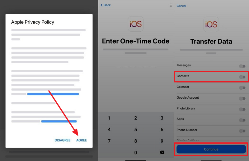 Step 2. Once you launch the “Move to iOS” app on your Android, tap “Agree” and enter the “One-Time” code received on your iPhone. After that, just toggle on the “Contacts” option and press the “Continue” button to start transferring.