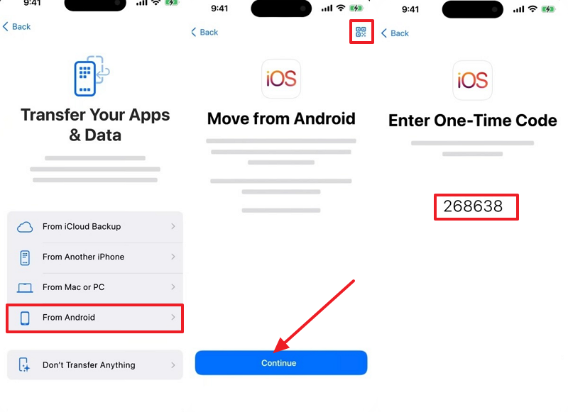 Step 1. When you set up your iPhone, tap the "From Android" option upon accessing the "Transfer Your Apps & Data" screen. Here, hit the "Continue" button to get the "One-Time Code" for further processing.