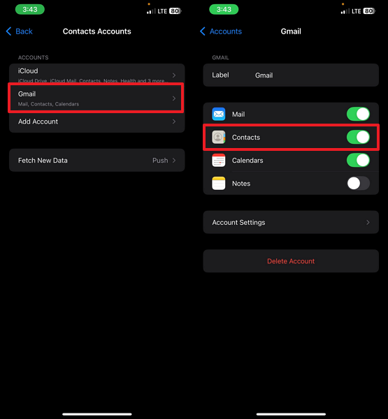 Step 4. Subsequently, choose the same “Gmail” account where you recently synced Android contacts and tap the “Contacts” toggle to sync them.