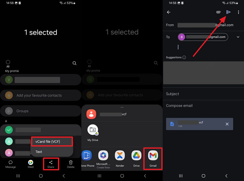 Step 1. When you launch the “Contacts” app on your Android, select your desired contact and choose the "Share” option. Afterward, tap the “vCard File (VCF)” option for sharing and then choose the “Gmail” platform. Now, enter your iPhone’s Gmail under the “To” section and press the “Send” button.