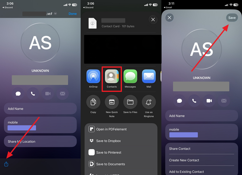 Step 3. Once open, tap the “Share” icon to select the “Contacts” app and hit the “Save” button.