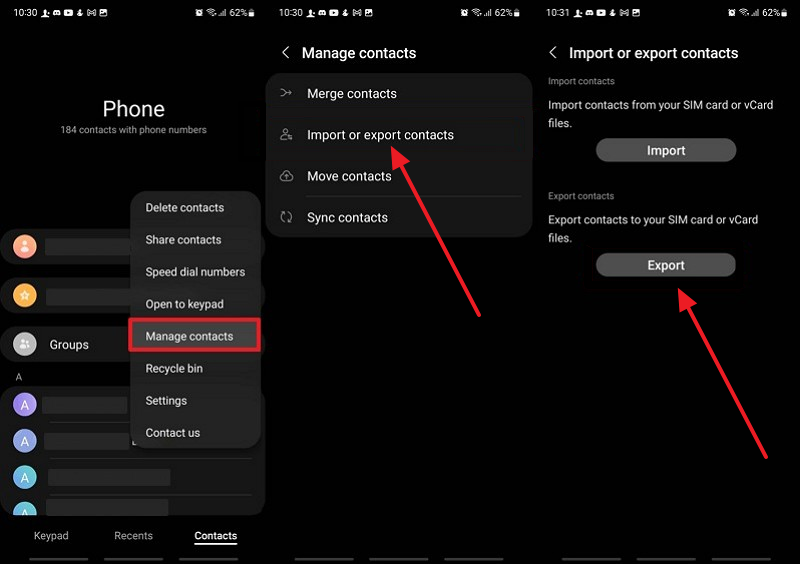 Step 1. Once you access the “Contacts” app on your Android, head to the “Manage Contacts” option. Then, tap the “Import or Export Contacts” option and hit the “Export” button.