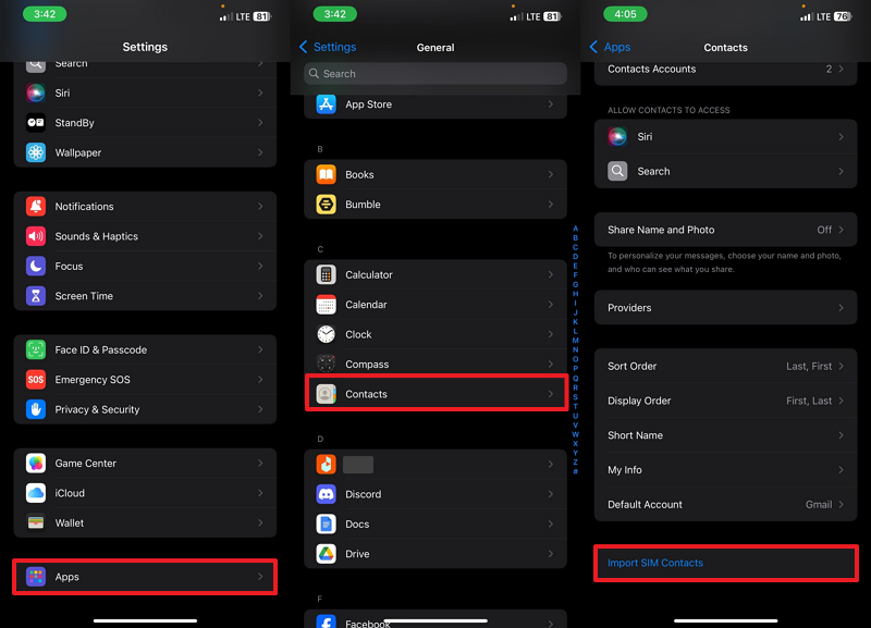 Step 2. After inserting the SIM card in your iPhone, go to the “Settings” to access the “Apps” section. After that, choose the “Contacts” app and swipe down to press the “Import SIM Contacts” option.
