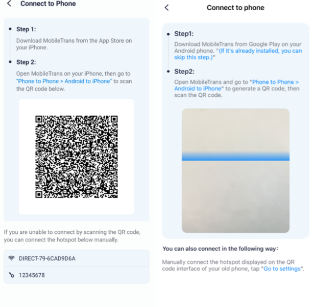 Step 3. On your iPhone’s MobileTrans app, access the “Phone to Phone” tab to select the “Android to iPhone” direction. Afterward, choose “Receive” and scan the displayed QR code using your Android to receive contacts.