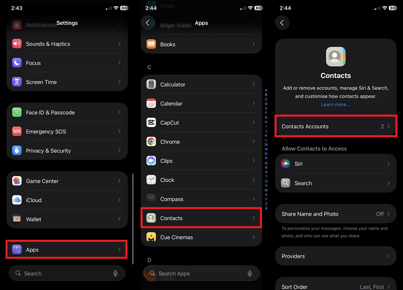 Step 3. On your iPhone’s settings, head to the “Apps” section to access the “Contacts” app. As you open its settings screen, go to the “Contacts Accounts” section.