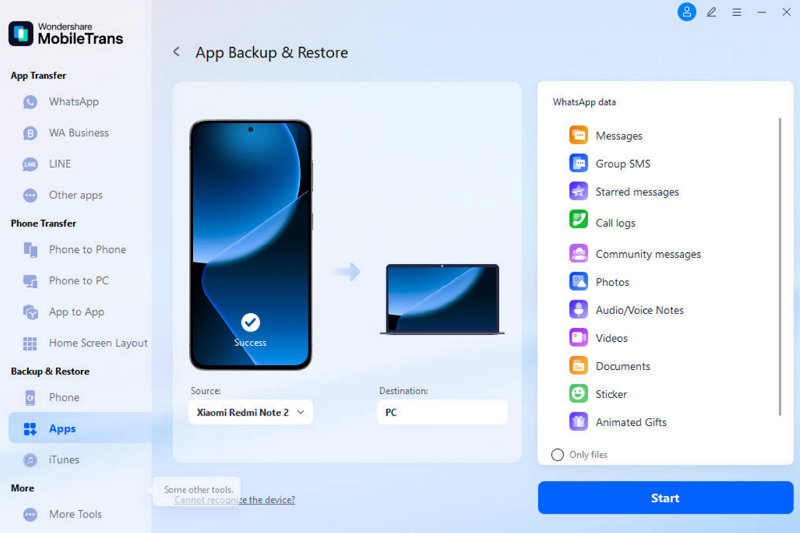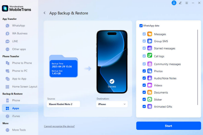 Once the backup is done, connect your iPhone to the PC, choose your preferred WhatsApp data to restore, and press the “Start” button. Wait patiently while the program converts and transfers data, and then a confirmation window will appear upon successful restoration.