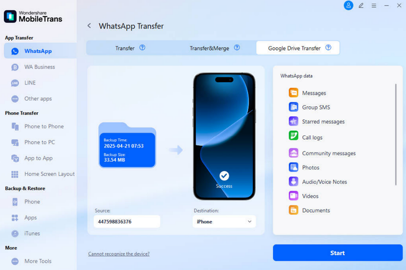 Google Backup provides a safe way for Android users to save their WhatsApp data on Google Drive. However, direct restore to iPhone is not supported because Android and iOS use separate cloud systems. This is where MobileTrans becomes useful, as it can read your Google Drive backup and restore it directly to your iPhone while protecting existing data. Thus, go through the guidelines below to move WhatsApp from Android to iPhone: