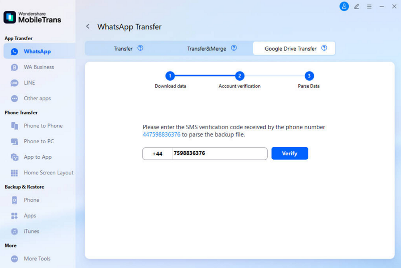 Choose your latest or preferred WhatsApp backup file and click the “Download” button to begin retrieving data. After this, enter the verification code for your Google account and confirm it by pressing the “Verify” option.