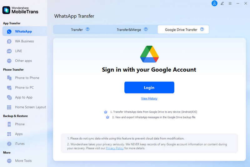 Go to the “App Transfer” section, pick “WhatsApp,” then select the “Google Drive Transfer” tab. Next, press the “Login” button and sign in using the Google account linked with your Android device.