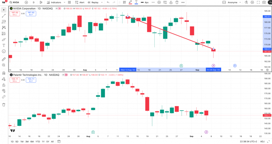 Markets also seem to echo that worry. Since August 13th, Nvidia stock price has dropped by a few points on the exchanges, and Palantir stock also slid close to 9%.