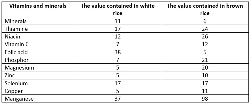The white rice is the brown rice which lost bran and seed. As a result, white rice is poor in some antioxidants, vitamin B, minerals, fats and fiber content, and a small amount of protein.Varieties of white rice are good enough to replace nutrients lost during processing. In the United States, manufacturers add B vitamins, such as thiamine, niacin, folic acid, as well as iron.As shown in the above table, brown rice contains higher amounts of vitamins and minerals than white rice, except for iron and folate, and it includes the same amount of selenium.Rice is gentle on the digestive system.Both brown and white rice are gluten-free by nature.Cooling the cooked rice leads to higher levels of fiber called starch resistance. This form of fiber may help promote bowel health, knowing that brown rice is rich with fiber content.