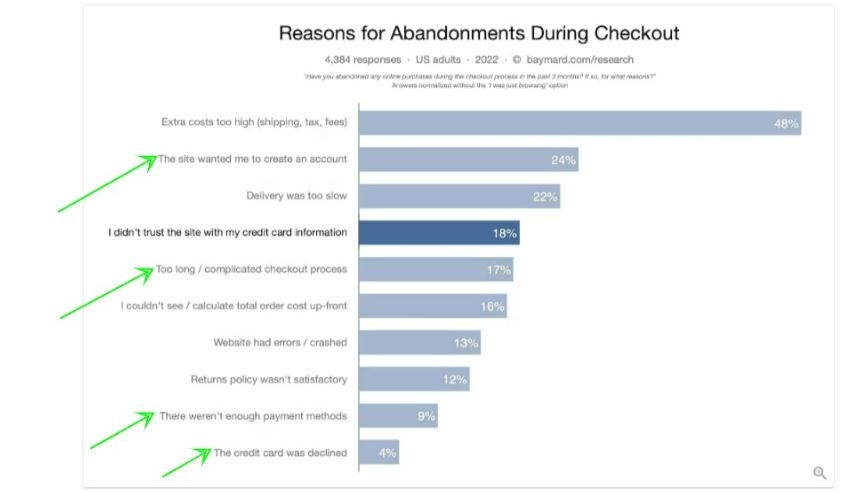 Another study by Baymard Institute reveals that 17% of cart abandonments occur due to a complex checkout process, 18% due to security reasons, and 9% due to limited payment methods.